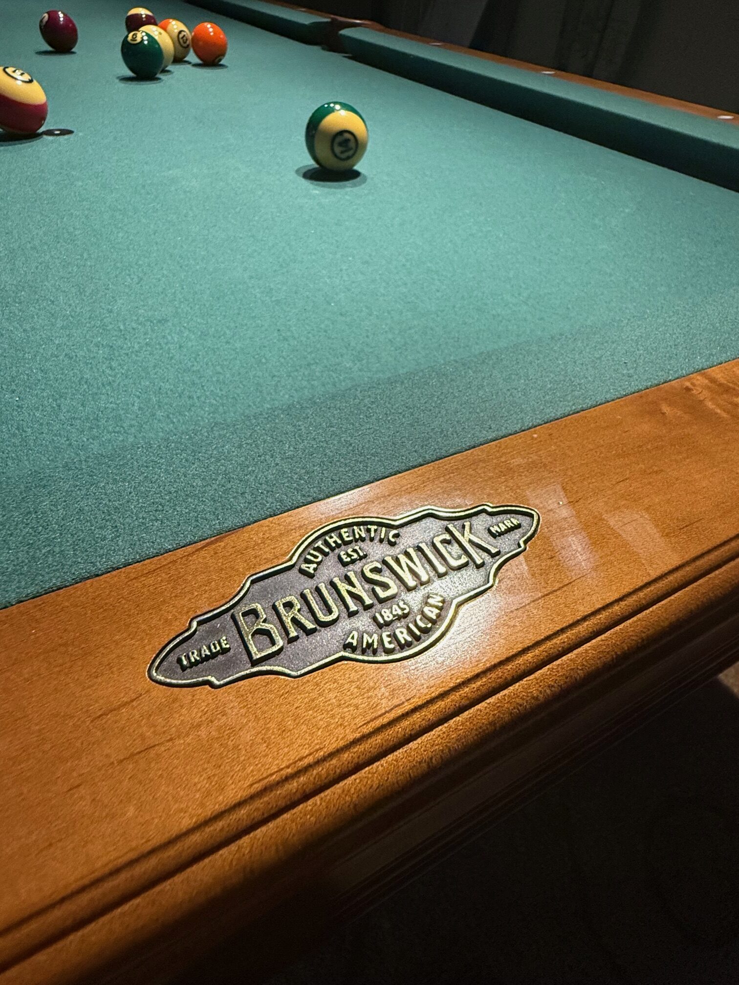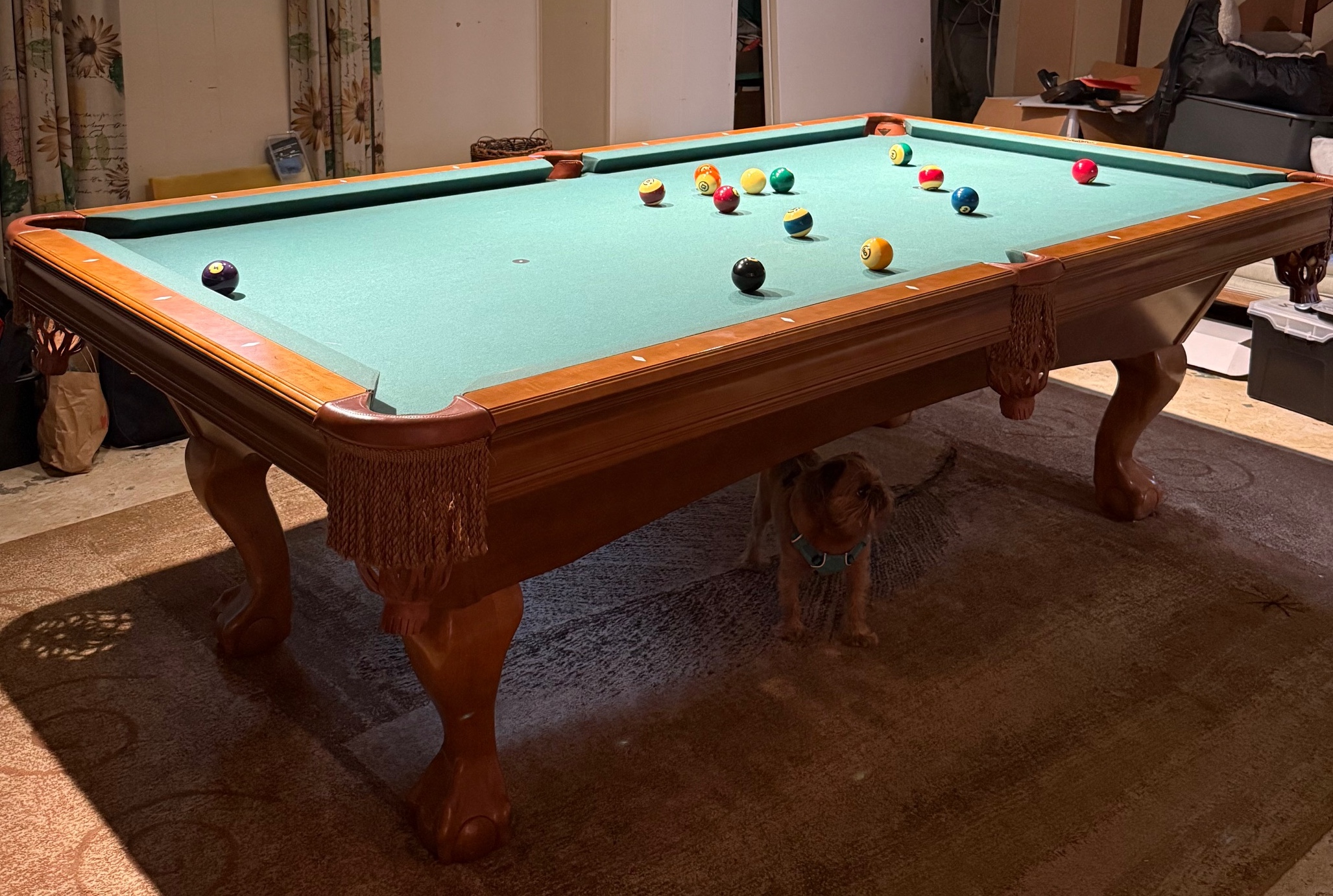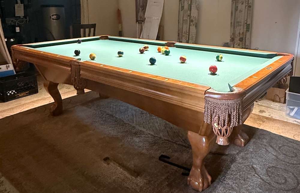 A beautiful, furniture-grade Brunswick Bradford pool table in pristine condition. Features classic claw-foot legs, a warm deep honey finish, and timeless craftsmanship — a standout piece that elevates any game room with traditional charm and sophistication.
