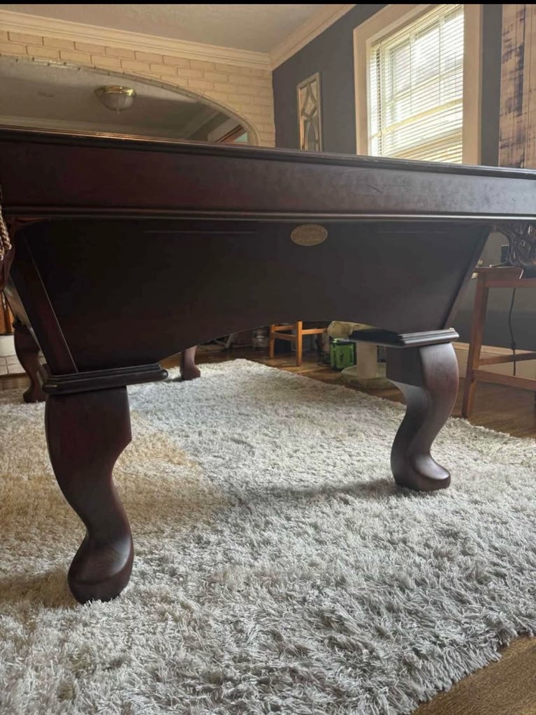 A beautiful, furniture-grade Olhausen pool table in excellent condition, finished in a rich mahogany tone that offers a warm, timeless look. Its classic styling and elegant details make it a perfect addition to any home or entertainment area.